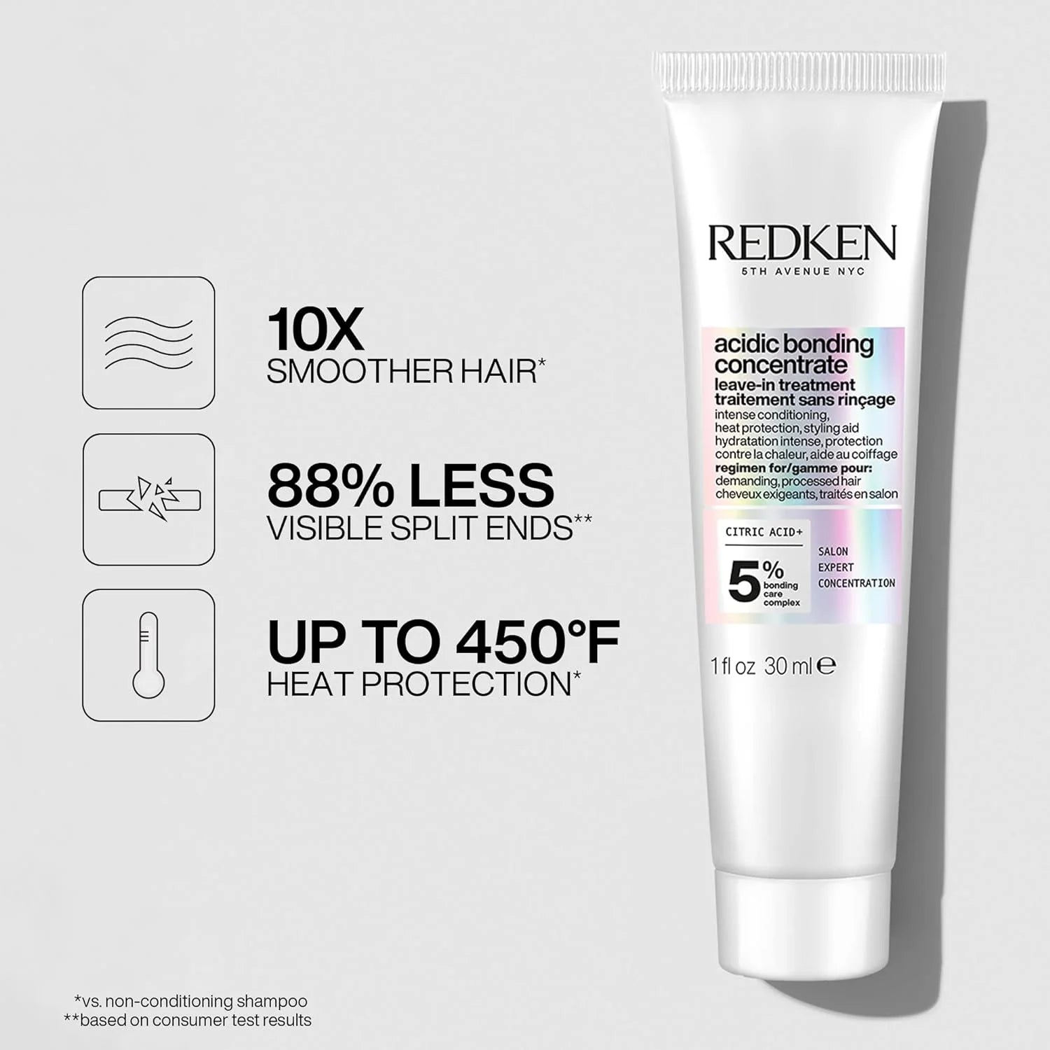 Redken's Acidic Bonding Concentrate is a leave-in treatment that provides ultimate strength, repair, intense conditioning and hair colour fade protection. Featuring Citric Acid, this leave-in treatment contains a concentrated bonding care complex that reinforces weakened bonds within the hair to improve hair strength. It provides heat protection up to 450 degrees, tames frizz, adds shine and reduces hair breakage. This pH-balancing leave-in conditioner is specifically formulated with an acidic pH to defend against the negative effect of hair colouring, styling tools, and even water. The result? Hair that looks and feels healthy. For best results, use alongside the Redken Acidic Bonding Concentrate Conditioner and Acidic Bonding Concentrate Shampoo.