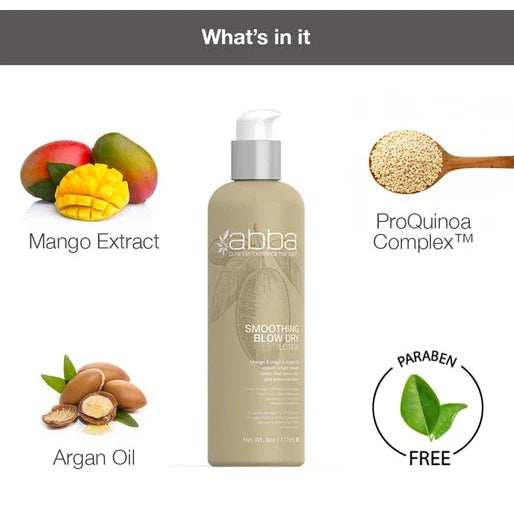 Abba Smoothing Blow Dry Lotion smooths, adds shine, and creates a lightweight hold to tame your hair and deliver next-level smoothness with less hassle. As always, it uses Abba's exclusive ProQuinoa Complex® containing hydrolyzed Quinoa, Barley, and Soy proteins to rescue damaged hair fibres to repair hair while boosting your style.