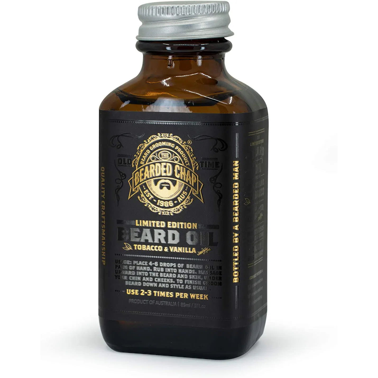 The Bearded Chap Tobacco & Vanilla Beard Oil is a must have for your grooming routine. This award-winning beard oil uses a combination of 11 base and essential oils, using only the finest oils sourced from around the world. Its quick-absorbing formula leaves behind no unnecessary grease or product build-up while keeping your facial hair hydrated and moisturized all day. Enjoy the dark and spicy Tobacco notes mixed with the sweet highlights of Vanilla, Tonka bean, and just a touch of leather and wood. Suitable for year-round use on those with light and heavy stubble to full beards.